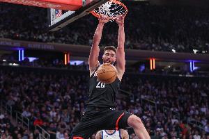 申京上半场出战17分钟7投5中拿到10分4篮板5助攻2盖帽,正负值-2,多次上演暴扣。